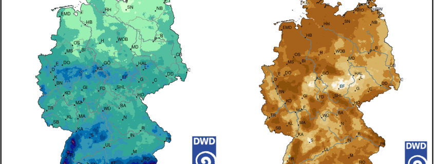 Die außergewöhnliche und anhaltende Trockenheit begann allerdings bereits Anfang Februar. Nimmt man diesen Monat noch mit hinzu, ergibt sich ein ähnliches Bild. Im Zeitraum vom 1. Februar bis zum 13. Mai zeigen aktuelle Auswertungen des stationsbasierten Niederschlags eine deutschlandweite Regenmenge von 81,8 mm. Dies entspricht weniger als die Hälfte (46 %) des üblichen Niederschlags in diesem Zeitraum. Ähnlich trocken war es einzig im Jahr 1976. Besonders trocken war es im Norden, wie Abbildung 1 (links) verdeutlicht. Vielerorts kamen dort nur 25 bis 50 mm zusammen, in Westmecklenburg stellenweise sogar noch weniger. Das Niederschlagsdefizit beträgt in vielen Regionen 75 bis 150 mm, stellenweise sogar noch mehr (Abbildung 1, rechts). Deutlich mehr Regen (aber dennoch unterdurchschnittlich) summierte sich am Alpenrand und im Schwarzwald mit immerhin 150 bis örtlich 300 mm auf, wo eine Dauerregenlage Ende März ergiebige Regenfälle brachte. Auch die Hohenloher Ebene östlich von Stuttgart und ein Streifen in der Mitte, etwa zwischen Köln und Erfurt, kamen etwas besser davon, da ebenfalls eine Dauerregenlage Anfang Mai dort nennenswerten Regen brachte.