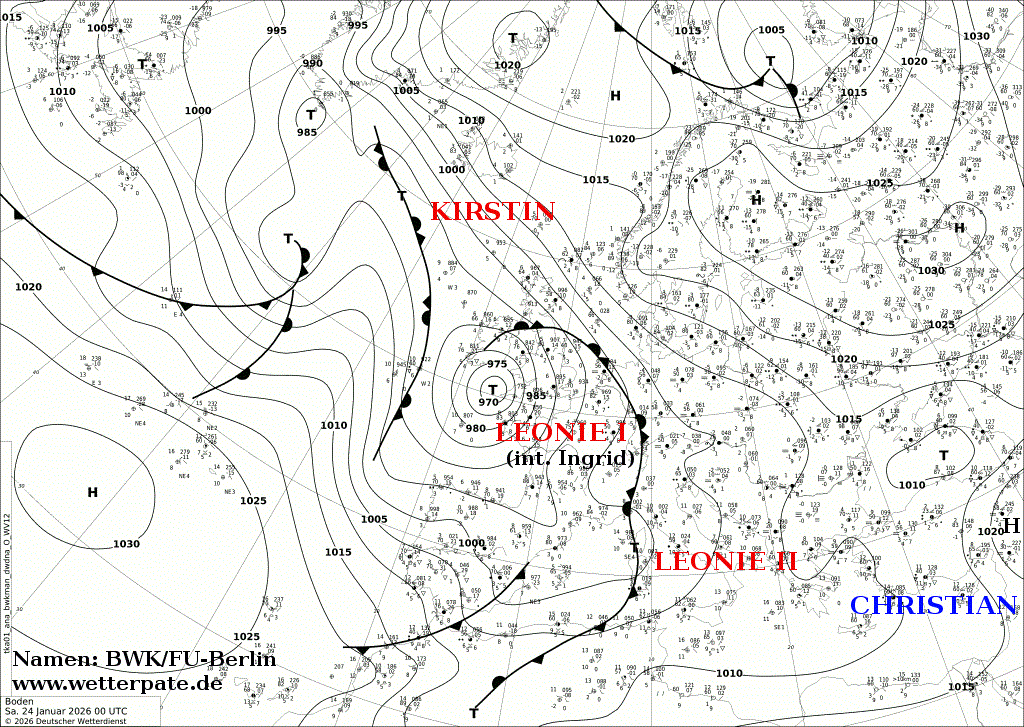Karte Europa und Nordatlantik mit Analyse von Isobaren und Fronten von Samstag, 24.01.2026, 0 UTC/1 MEZÂ