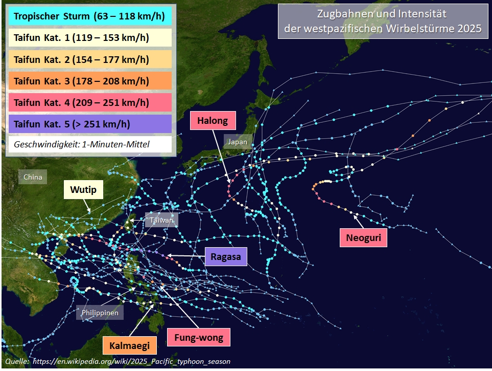 Zugbahnen und Intensität der tropischen Wirbelstürme über dem westlichen Nordpazifik 2025 (Stand: 18.12.2025). (Quelle:https://en.wikipedia.org/wiki/2025_Pacific_typhoon_season)