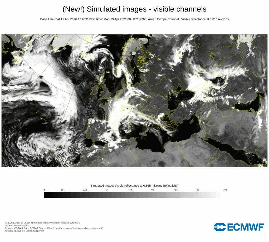 Simulierter Satellitenfilm für die kommenden drei Tage, in 3-Stunden-Schritten, basierend auf der simulierten Reflektivität der Wolken im europäischen IFS Modell, im sichtbaren Spektrum und unter der Annahme dass die Sonne 24/7 im Zenit steht – deshalb hier auch nachts verfügbar. (Quelle: ECMWF)