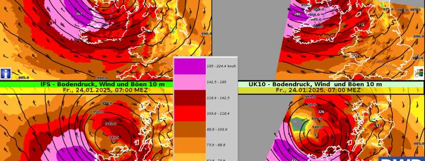 Dieser Höhepunkt hat es in sich. Freitagfrüh simulieren die verschiedenen Wettermodelle für Éowyn, der dann knapp westlich von Irland liegt, einen Kerndruck zwischen 933 und 945 hPa. Dies sind außerordentlich niedrige Werte für diese Region. Der Irlandrekord für den niedrigsten Luftdruck liegt bei 931 hPa und stammt vom 28. November 1838. Doch nicht nur der absolute Luftdruck ist bemerkenswert, auch der Luftdruckfall ist enorm. Von Heute früh mit etwa 985 hPa geht es in 24 Stunden um 40 bis 50 hPa abwärts.