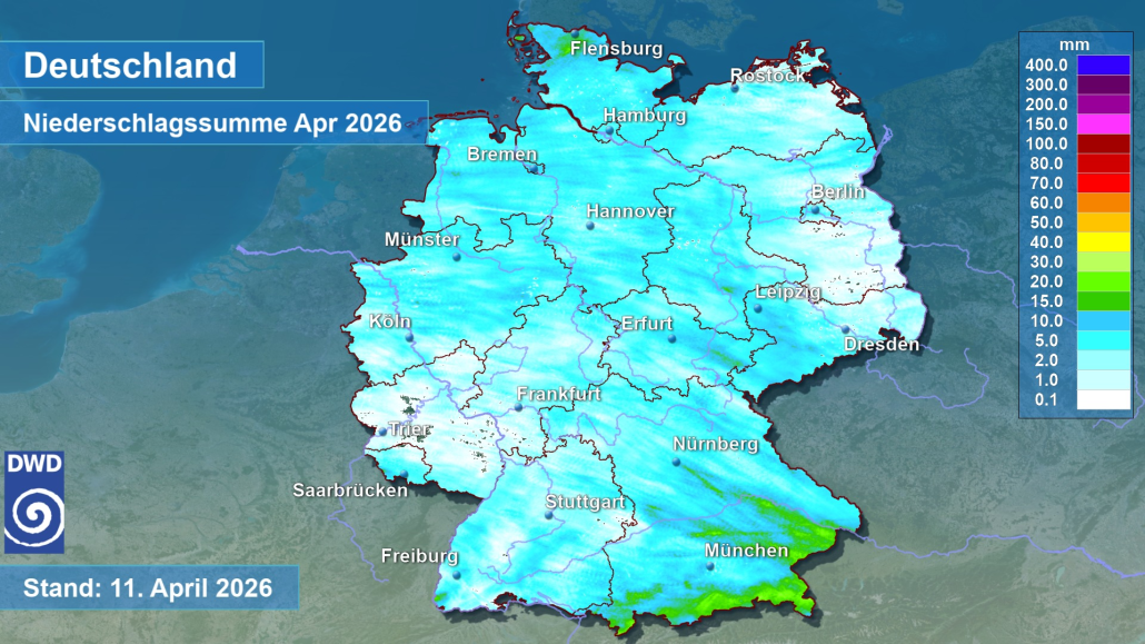Das Wort Regen oder Schauer las man in den Wetterberichten im bisherigen April in Deutschland sehr selten. Umfangreiche Hochdruckgebiete sorgten hierzulande für eher trockenes und oftmals sonniges Frühlingswetter. Bereits jetzt stehen schon 60 bis 90 Sonnenstunden zu Buche. Dies bedeutet im Schnitt sechs bis neun Stunden Sonne pro Tag. Klimatologisch betrachtet wird die aufgeführte Gesamtsonnenscheindauer erst zum Ende der zweiten Aprildekade erreicht. Während also die Sonne Überstunden leistet, zeigt sich der Niederschlag fast überall von seiner sparsamen Seite. Deutschlandweit fielen seit Beginn des zweiten meteorologischen Frühlingsmonats häufig nur zwischen 1 und 10 Liter pro Quadratmeter (l/qm). Lediglich im Norden und im Umfeld der zentralen und östlichen Mittelgebirge waren es gebietsweise 10 bis 15 l/qm. Etwas aus der Reihe tanzt der Süden und Südosten Bayerns. Dort gab es in der Fläche bereits 10 bis 20, am Alpenrand örtlich bis 30 l/qm. Der meiste Niederschlag fiel dort am gestrigen Freitag.