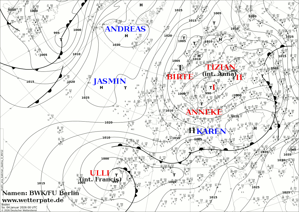 Analyse der Wetterlage in Europa vom 04.01.2026 00 UTC (Quelle:DWD)