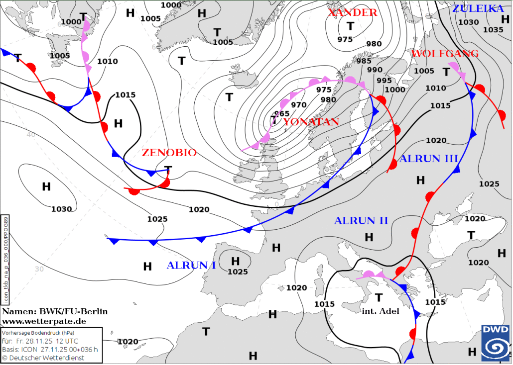 Bodenanalyse mit Fronten und Luftdruck, Freitag den 29.11.2025 12 UTC (Quelle: DWD)