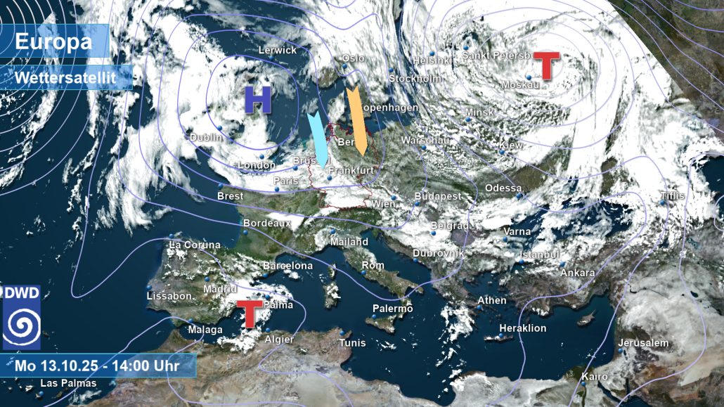 Die aktuelle Wetterlage zeigt ein umfangreiches Hochdruckgebiet bei den Britischen Inseln. Deutschland liegt am Rande dieses Hochs, genauer gesagt an der Ostflanke, in einer nördlichen bis nordwestlichen Strömung, mit der in unteren Luftschichten feuchte Luft herantransportiert wird (bläulicher Pfeil). Trockener ist es hingegen durch Skandinavien-Föhn im Nordosten (gelb-orangefarbener Pfeil).
