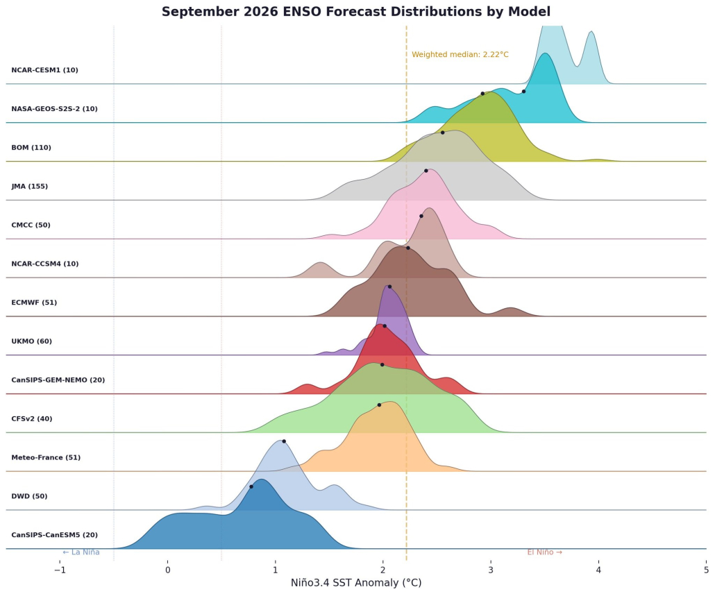 In der vergangenen Woche wurde El-Niño in einigen Medien zum Thema gemacht und tatsächlich liefern verschiedene Modelle deutliche Hinweise auf das Auftreten dieses Phänomens im Laufe des Jahres. Bei genauerer Betrachtung zeigt sich jedoch die Komplexität der Datenlage. In Abbildung 1 sind für den September 2026 von verschiedenen Modellen die prognostizierten Abweichungen der Meeresoberflächentemperatur für den relevanten Teil des Pazifiks dargestellt. Für jedes Modell ist dann nochmal die Bandbreite innerhalb des Modells als Farbbereich aufgetragen. Ab +0,5 Grad Abweichung spricht man von einem El-Niño-Ereignis. Die meisten Modellergebnisse konzentrieren sich bei Anomalien um +2 Grad. Die Bandbreite reicht aber von -0,5 bis +4 Grad. Ab +2 Grad Abweichung spricht man von einem sehr starken El-Niño. Das Modell des Deutschen Wetterdienstes ist dabei ein eher „kühler“ Vertreter mit Abweichungen um +1 Grad. Das Modell des Europäischen Zentrums für Mittelfristvorhersage (ECMWF) befindet sich mit etwa +2 Grad Abweichung im Mittelfeld der Modelle.