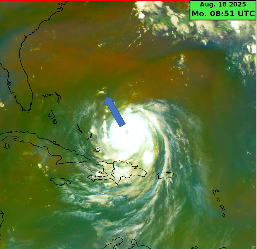 ERIN hatte sich am Samstagabend zwischenzeitlich zu einem Hurrikan der höchsten Kategorie 5 entwickelt. Der Hurrikan befindet sich in leicht abgeschwächter Form aktuell mit seinem Zentrum nördlich der Dominikanischen Republik und wird in den kommenden Tagen zunächst seinen nordwestlichen bis nördlichen Kurs beibehalten. Dabei bleibt seine Intensität zunächst nahezu unverändert. Glücklicherweise wird er aber über dem Meer bleiben und dabei nur einzelne Inselgruppen am Rande beeinflussen. Südöstlich von Neufundland wird ERIN voraussichtlich zu Beginn des kommenden Wochenendes die Transformation von einem tropischen Wirbelsturm in eine extratropische Zyklone vollziehen.