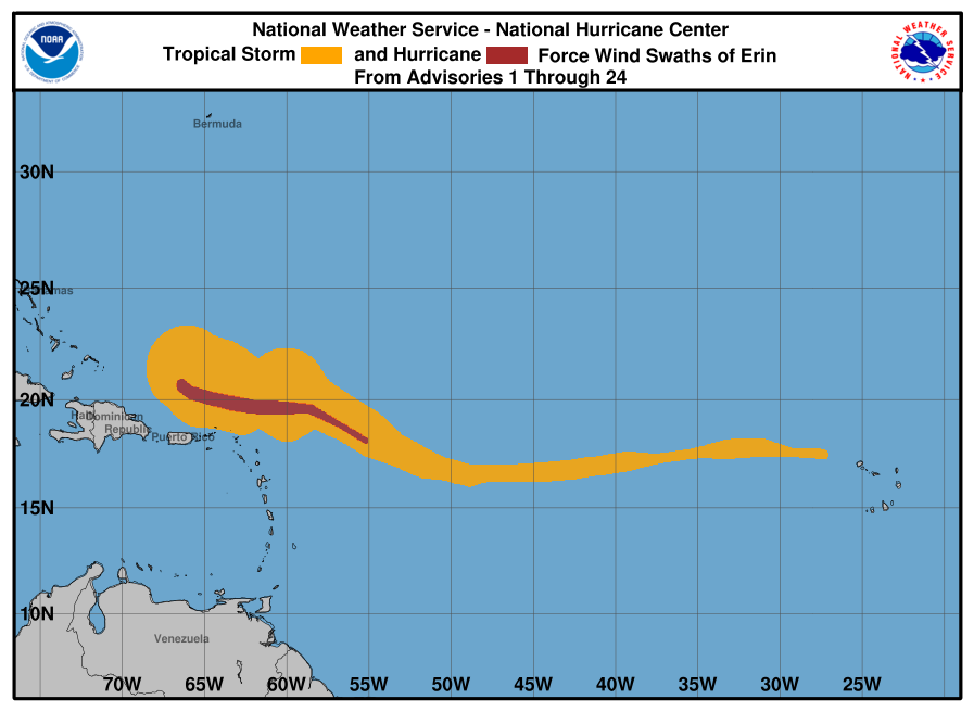 ERIN zieht bislang über den freien Ozean. Landmassen wurden bisher verschont und auf seiner weiteren Zugbahn wird ERIN sehr wahrscheinlich keine Inseln direkt treffen, sondern nördlich der Karibik, östlich der Bahamas und westlich der Bermuda-Inseln nach Nordwesten und später nach Norden ziehen. Dennoch werden Teile der genannten Inselgruppen von Ausläufern ERINs erfasst. Dabei stehen erneut weniger der Wind als heftige Niederschläge und an der Küste auch hoher Seegang im Fokus.