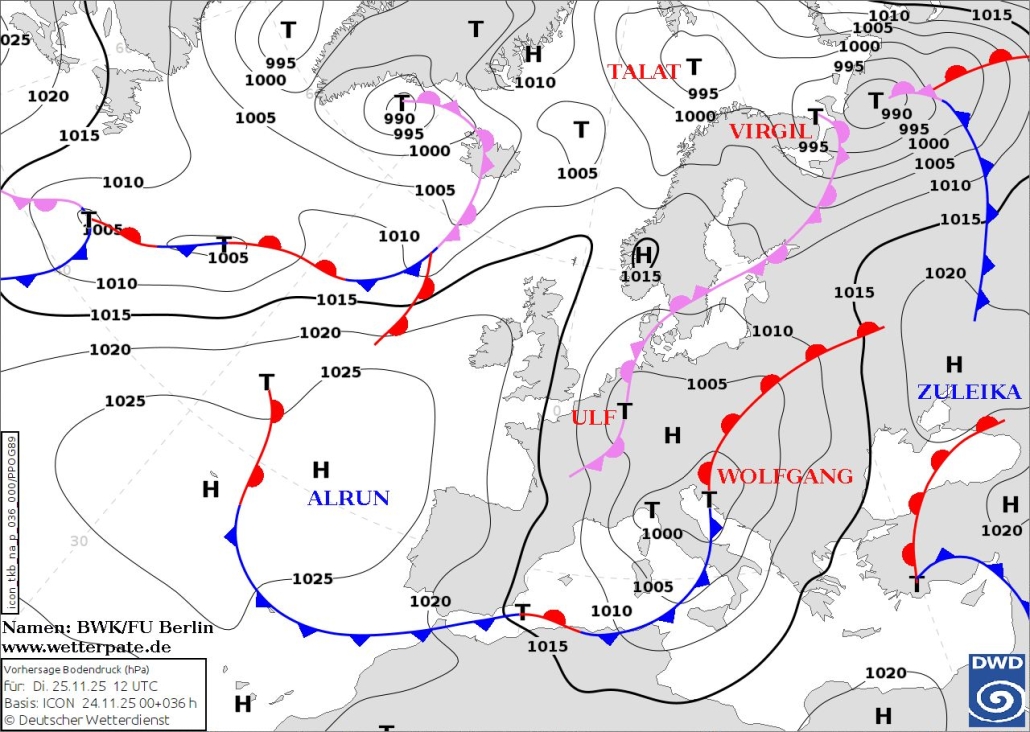 Prognosekarte Bodendruck und Lage der Fronten mit Namen der steuernden Hoch- und Tiefdruckgebiete für den heutigen Dienstag, den 25.11.2025 12 UTC