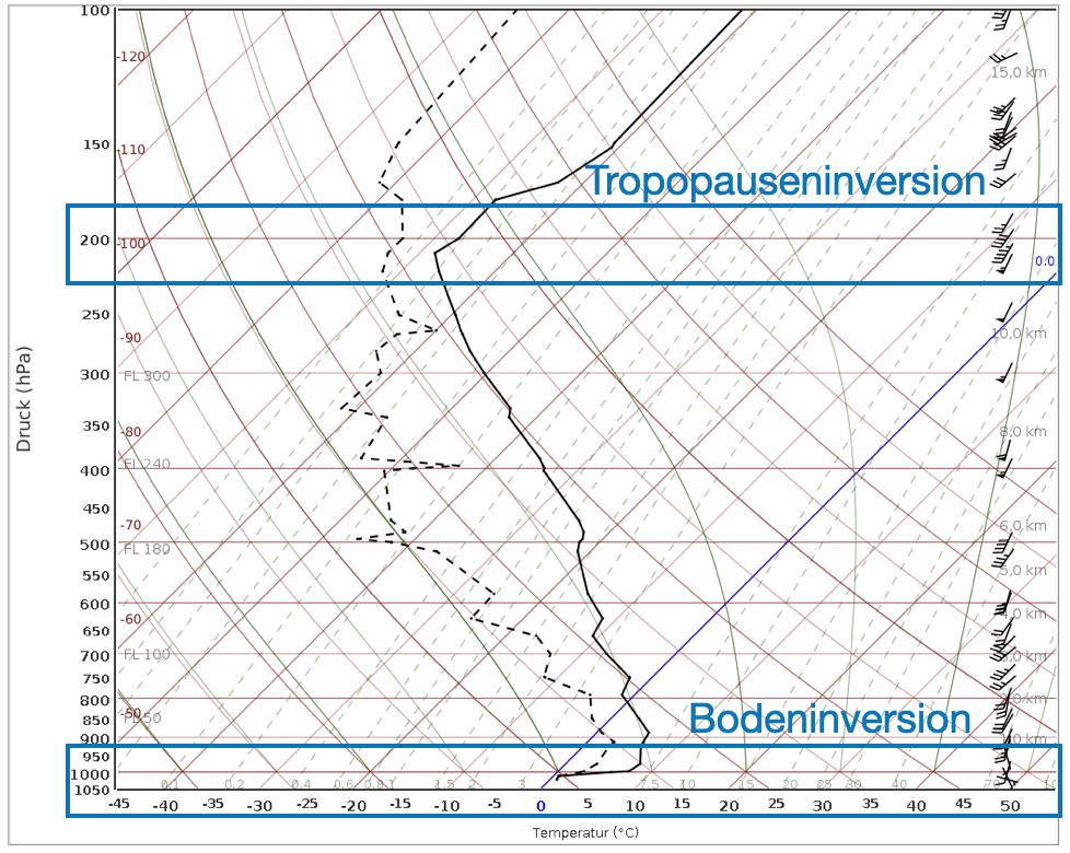 Die Tropopauseninversionsschicht stellt, ebenfalls analog zur bodennahen Inversion, eine Transportbarriere dar, die den Austausch von Spurengasen zwischen Troposphäre und Stratosphäre hemmt. Wie stabil diese Sperrschicht letztlich ist, ist jedoch weiterhin Gegenstand aktueller Forschung. Eine zentrale Motivation hierfür liegt in den Auswirkungen der Spurengasverteilung auf den Strahlungshaushalt der Atmosphäre (Stichwort Klimawandel) sowie im Einfluss anthropogener Spurengasemissionen auf die Stratosphärenchemie. Ein Hinweis auf einen möglichen Mischungsprozess trotz hoher Stabilität findet sich in den Windfiedern im Bereich der Inversion bei 200 hPa in Abbildung 1 (vergleiche Thema des Tages vom 22.05.2016).