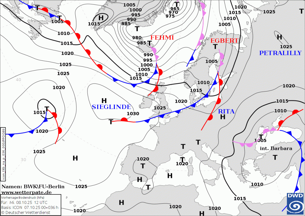 Aktuelle „Berliner Wetterkarte“ vom Mittwoch, 08. Oktober 2025 mit den Hochs PETRALILLI, RITA und SIEGLINDE und dien Tiefs EGBERT und FEHMI.