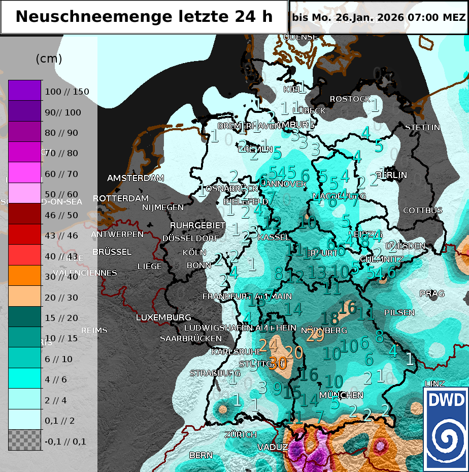 24 stündige Neuschneemenge in cm zwischen 25. und 26.01.2026, 7 Uhr.