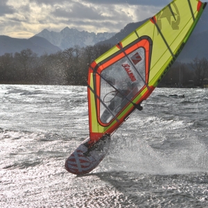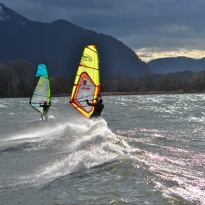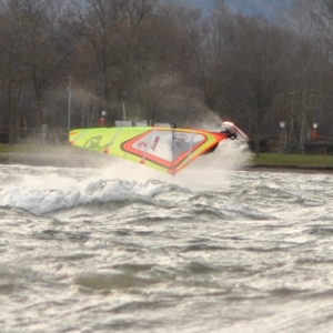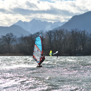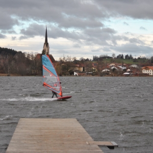 Vormittags auf 9.00 in Übersee 8 – 9 Bft. und deshalb sind wir 10 KM nördlicher vom Chiemsee zum Obinger See gefahren und es war mit 4,8er gut.