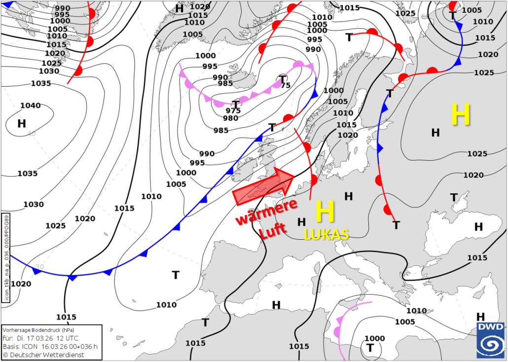 Abbildung 1: Bodendruckverteilung und Fronten am morgigen Dienstag, 17.03.2026, 12 UTC (13 Uhr mitteleuropäische Zeit, MEZ).