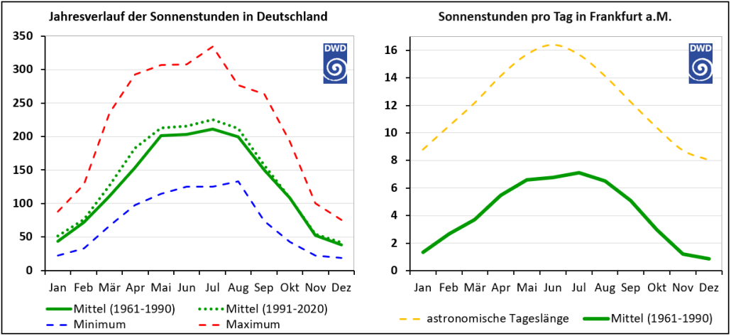 Links: Jahresverlauf der Sonnenstunden in Deutschland mit vieljährigen Mittelwerten 1961-1990 und 1991-2020 sowie der Extrema der einzelnen Monate; rechts: Vergleich astronomische Tageslänge und durchschnittlich gemessene Sonnenstunden pro Tag der einzelnen Monate in Frankfurt am Main. Quelle: DWD