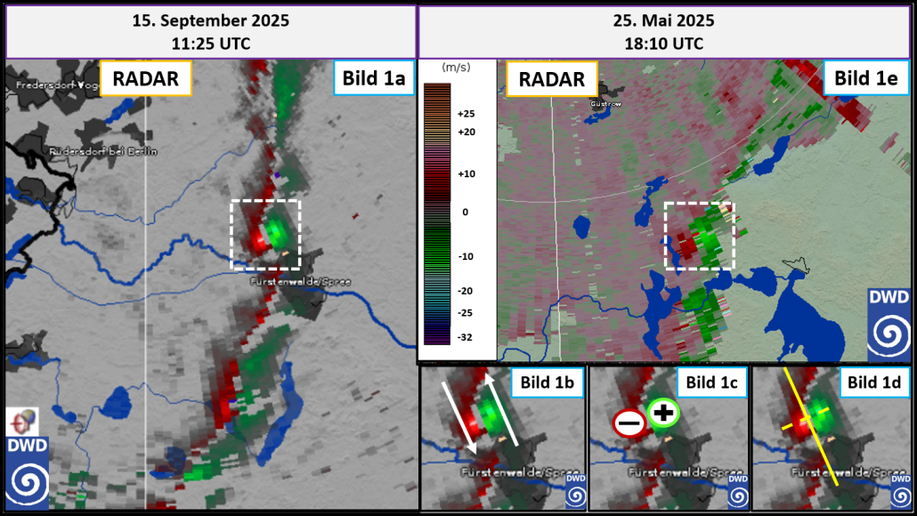 Von Bedeutung ist auch, wie fokussiert die Rotation im Wetterradar erscheint. Während diese bei Fürstenwalde (15. September) sehr kompakt ausfällt, sieht sie am 25. Mai (Bild 1e) deutlich diffuser und schwächer aus. Sollten zahlreiche weitere Umgebungsbedingungen günstig sein, dann muss man bei beiden Signalen auf jeden Fall mit einer erhöhten Gefahr vor Windböen rechnen. Besonders bei der Rotation nördlich von Fürstenwalde kann aber auch ein Tornado nicht ausgeschlossen werden, wobei aber dieser vor allem in dieser Entfernung nicht direkt vom Radar erfasst wird.