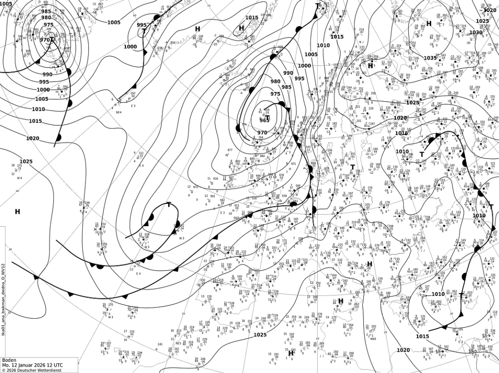 Analysekarte für Europa mit Lage der Druckgebilde und Isobaren sowie Stationsdaten am Montagmittag, den 12.01.2026 um 12 UTC