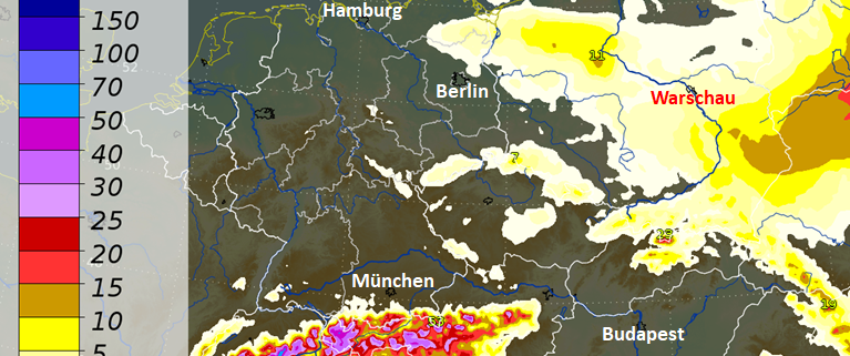 In der zweiten Wochenhälfte reduziert sich der Wassereintrag dann deutlich. Einerseits, weil sich Hochdruck breitmacht und damit der Niederschlag nachlässt. Andererseits, weil die Schneefallgrenze sinkt und die erwarteten Niederschläge zunehmend in Schnee übergehen. Die Abbildung 4 zeigt den über 72 Stunden akkumulierten Schnee (bzw. das entsprechende Wasseräquivalent). Man kann dabei sehr grob annehmen, dass ein l/qm an Wasser einem cm Schnee entspricht. Entsprechend lässt sich aus der Grafik ablesen, dass in den Deutschen Alpen durchaus 10 bis 30 cm Neuschnee zu erwarten sind. Und auch bei unseren polnischen Nachbarn kann sich zumindest gebietsweise wieder eine dünne Schneedecke ausbilden (wenn der Schnee denn komplett liegenbleibt).