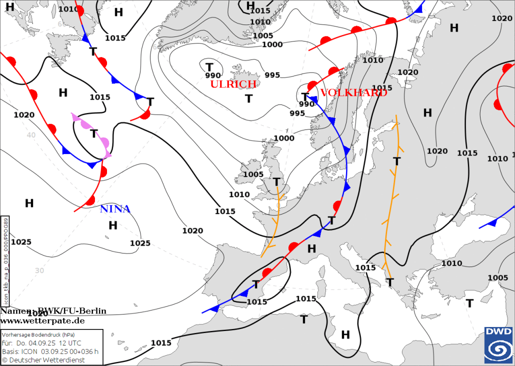 DWD-Vorhersagekarte für den Bodendruck und die Luftmassengrenzen im Bereich von Europa und dem Nordostatlantik für Donnerstag, den 04. September 2025, 12 UTC auf Basis des ICON-Modelllaufs vom 03. September 2025, 00 UTC.