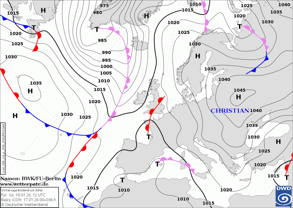 Atlantische Tiefdruckgebiete haben Anfang der Woche die Frostluft aus Deutschland ostwärts verdrängt. Sie brachten Schnee und (gefrierenden) Regen. Doch der Tiefdruckeinfluss hielt nicht lange. Bereits am heutigen Samstag dominiert bereits wieder hoher Luftdruck. Namentlich ist es Hoch CHRISTIAN über Westrussland und Osteuropa, dessen Einfluss bis nach Mitteleuropa reicht.