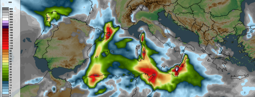 Aufaddierter Gesamtniederschlag des ICON-Wettermodells bis Mittwoch Früh im Bereich des Westlichen Mittelmeeres
