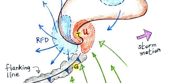 Oftmals lässt sich am Rande einer Superzelle eine Kette von Haufenwolken beobachten: Die sogenannte „Flanking Line”. Dabei trifft warme Luft am Boden, die von der Zelle angesaugt wird („Inflow” genannt) auf den Pool ausfließender kalter Luft auf der Rückseite der Superzelle (RFD). Dabei muss die warme Luft des Inflows zwangsläufig auf die dichtere kalte Luft aufgleiten. Dabei bildet sich die Wolkenkette aus (Alle Features siehe Abbildung 1).
