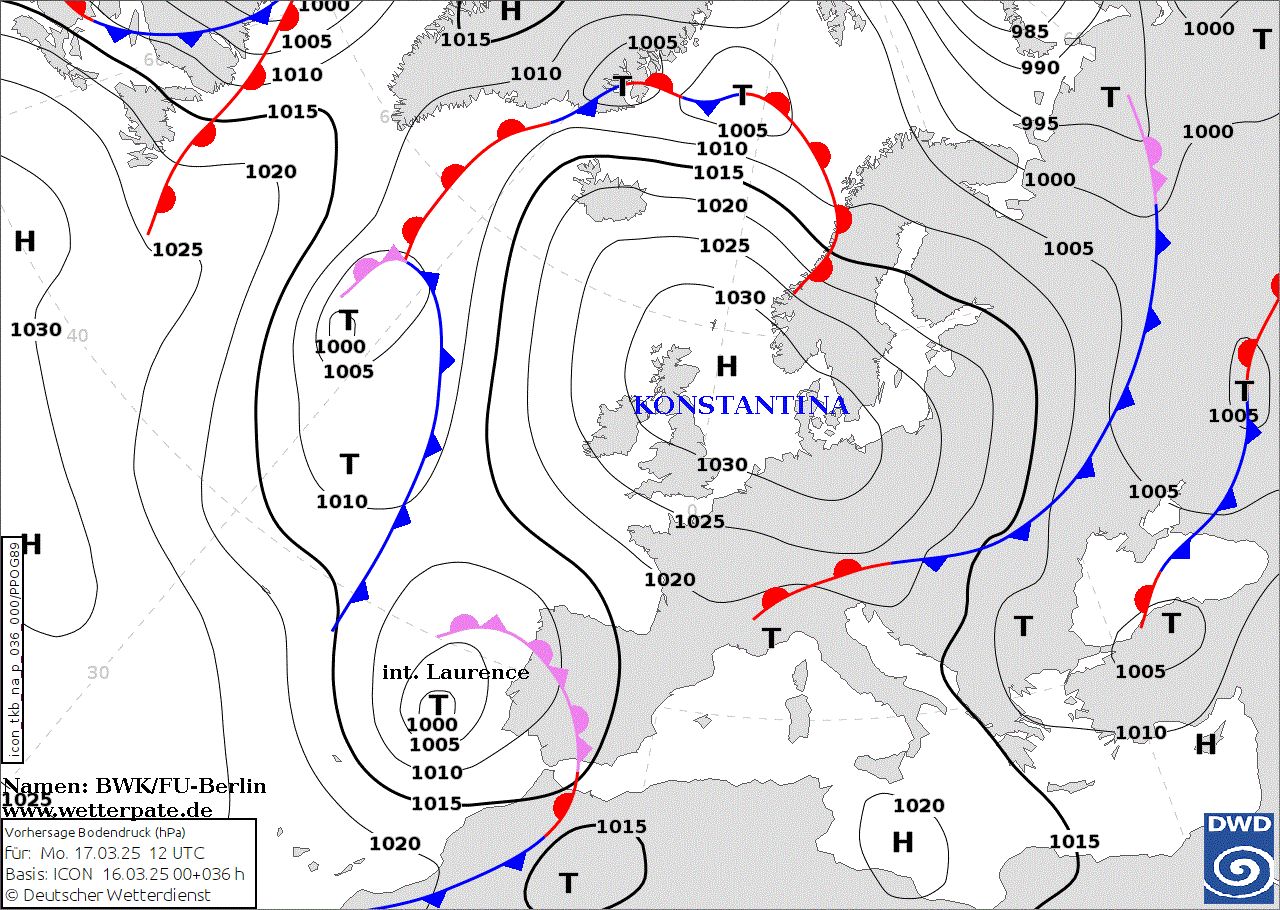 Karte Europa und Nordatlantik mit Isobaren und Fronten für Montag, 17.03.2025 mittags (Quelle: DWD)
