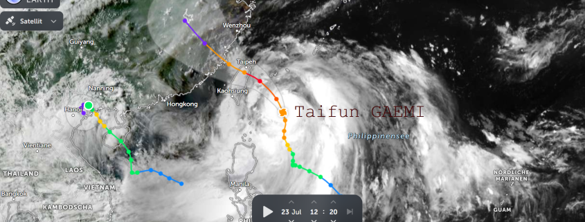 Die Taifun- und Hurrikansaison ist in vollem Gange. Während sich die Entwicklung von Hurrikans derzeit noch in Grenzen hält, hat sich in der Philippinensee ein tropisches System nun zum ausgewachsenen Taifun gemausert. Dieser trägt den Namen „GAEMI“ bzw. im philippinischen Sprachgebrauch „CARINA“ und aktuell (Stand, Dienstag, den 23.07.2024 um 06 UTC) der Kategorie 2 zugeordnet. Er befindet sich etwa 600 km südöstlich von Taipeh (Taiwan).