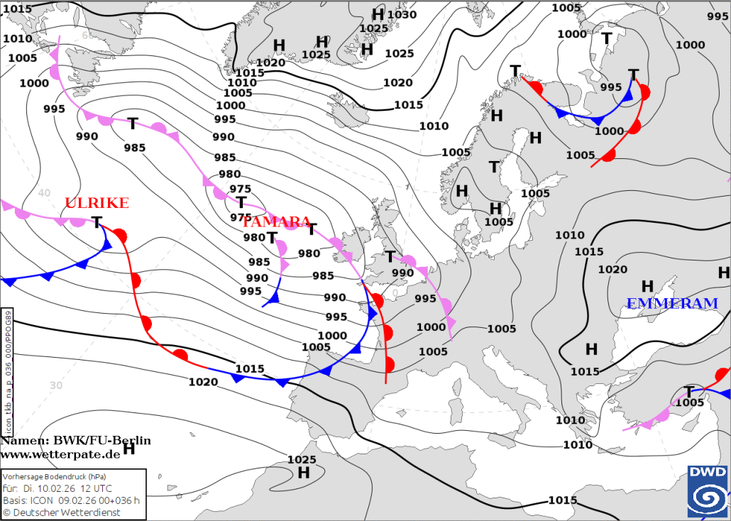 Die zweite Februarwoche startete weitgehend mit ruhigem und nach Südwesten hin auch mit mildem Winterwetter. Verantwortlich dafür war HOCH EMMERAM, welches am gestrigen Montag mit seinem Schwerpunkt über dem Baltikum lag. EMMERAN hat sich nun aber unter allmählicher Abschwächung zum Schwarzen Meer verlagert. Gleichzeitig erfasste uns bereits am Morgen die Okklusionsfront eines Tiefs bei den Britischen Inseln. Damit kamen bereit in der Früh im Südwesten die ersten Regenfälle auf. Größere Niederschlagsmengen kommen dadurch aber zunächst einmal nicht zustande.
