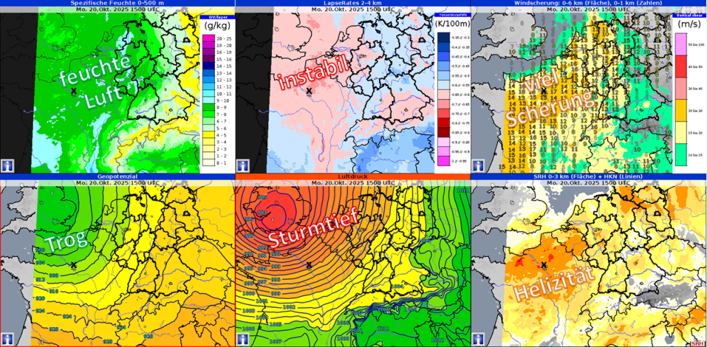 Abbildung 1 zeigt die Zutaten für Konvektion und Tornados zum Zeitpunkt des Tornados bei Paris. Feuchtigkeit und Instabilität waren ausreichend vorhanden. Zudem herrschte im Umfeld eines kräftigen Tiefs über Südengland mäßige bis starke Scherung, sowohl niedertroposphärisch als auch hochreichend. Besonders auffällig ist die starke Helizität, also Wirbelhaftigkeit der Luftmasse, die durch starke Richtungsscherung in den unteren Luftschichten generiert wird und durch die etwaige Tornados genährt werden. Durch einen von Westen aufziehenden Trog wurde die Luft großräumig gehoben und es entstanden Schauer und Gewitter.