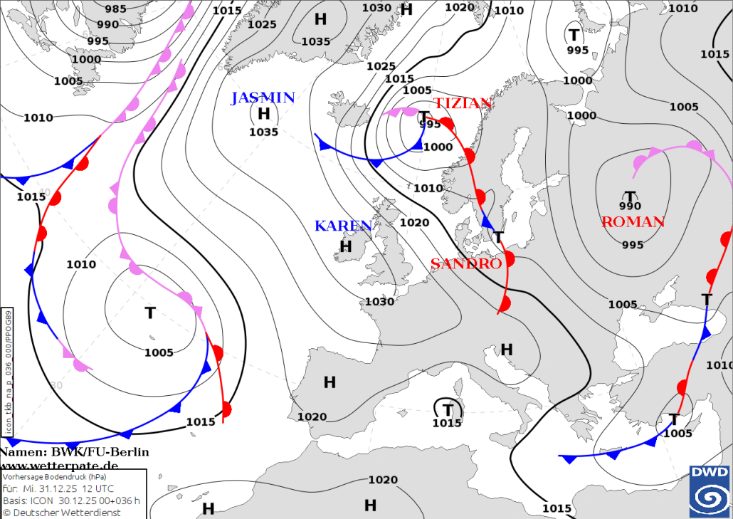 In Richtung Jahreswechsel änderte sich die Wetterlage dann aber sukzessive um. Das blockierende Hoch JASMIN verlagerte sich mit seinem Schwerpunkt in Richtung Südgrönland. Damit wurde der Platz frei für Tief TIZIAN. TIZIAN befindet sich aktuell als ausgewachsenes Sturmtief mit seinem Zentrum über Südnorwegen. Die Kaltfront des Tiefs verlagert sich im Laufe des Tages allmählich über Norddeutschland hinweg nach Südosten. Hinter dieser Front strömt vor allem in der Höhe Kaltluft nach Deutschland. Dadurch wird die Troposphäre labilisiert und es treten vermehrt schauartige Niederschläge auf. Die Schneefallgrenze befindet sich heute tagsüber bei etwa 200 bis 400 Metern und sinkt in der Nacht vor allem bei stärkeren Schauern bis ins Tiefland ab.