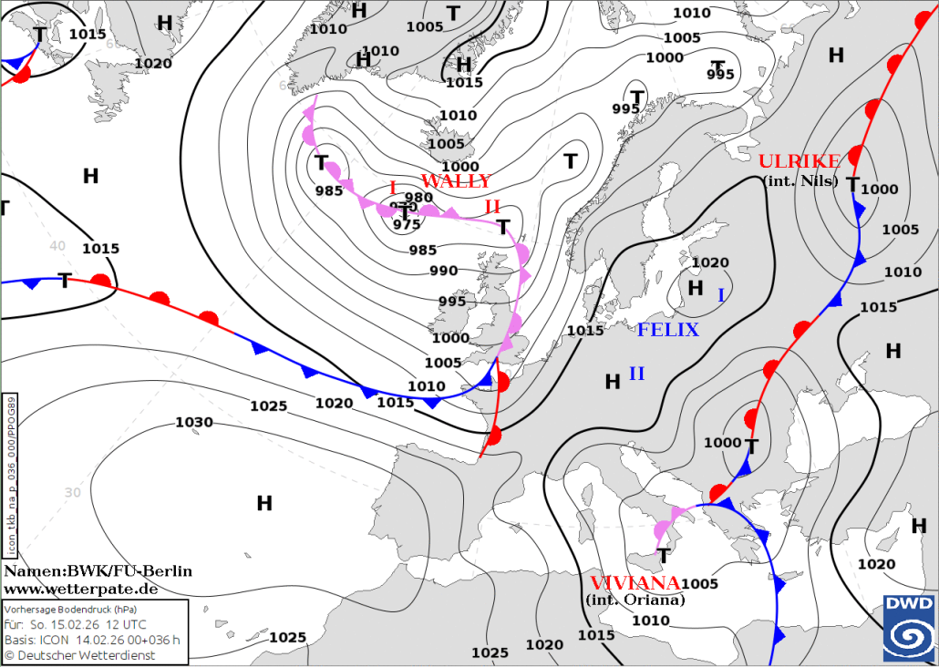 Vorhersagekarte für Sonntag, den 15.02.2026 um 12 UTC. Deutschland liegt unter Zwischenhocheinfluss. Die teilokkludierte Front von TIEF WALLY verlagert sich von Frankreich in den äußersten Südwesten des Landes.