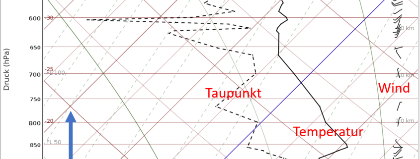Ein Radiosondenaufstieg kann die Inversion durch Messungen der Luftfeuchtigkeit und Temperatur belegen. Der Aufstieg von heute früh in Idar-Oberstein zeigt beispielweise eine sprunghafte Zunahme der Temperatur in rund 540 m Höhe. Von etwa 3 Grad steigt sie innerhalb weniger Dekameter auf 9 Grad und in knapp 1500 m Höhe sogar auf 11 Grad an. Gleichzeitig nimmt die relative Feuchtigkeit ab. Das sieht man daran, dass sich der Abstand von Taupunkt zu Temperatur vergrößert bzw. überhaupt erstmals ein Abstand vorhanden ist.