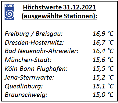 Ein genauerer Blick fördert dann aber doch teils bemerkenswerte Unterschiede zutage. Und dies betrifft vor allem die oben schon dezent angesprochenen Höchsttemperaturen. Die Abbildung eins zeigt für einige ausgewählte Stationen die Temperaturmaxima am 31.12.2021. Der Jahreswechsel 2021 / 2022 war der wärmste seit Beginn der Temperaturmessung in Deutschland. Zwar steckten im Norden wegen des Regens und der dichten Wolken die Maxima in einer Spanne von 10 °C bis 14 °C „fest“ (was ja auch schon sehr mild ist), aber in der Mitte und im Süden war es für die Jahreszeit ungewöhnlich mild, verbreitet mit Temperaturen jenseits der 15 °C-Marke.