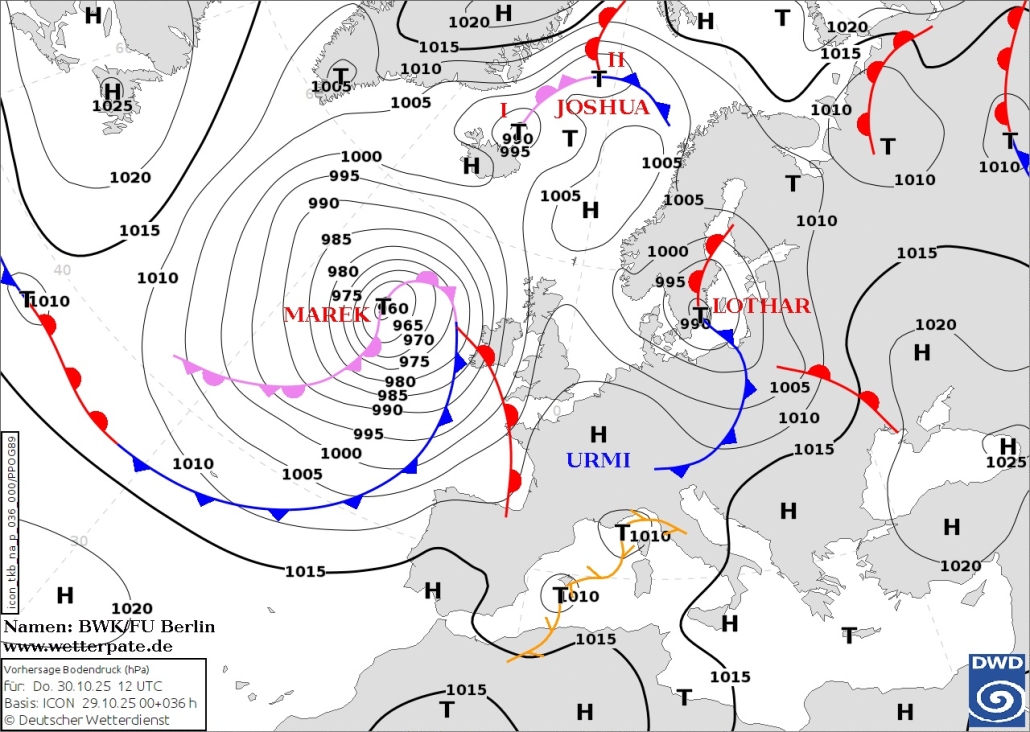 Karte Europa und Nordatlantik mit der Vorhersage von Bodendruck und Fronten für Donnerstag, 30.10.2025 mittags