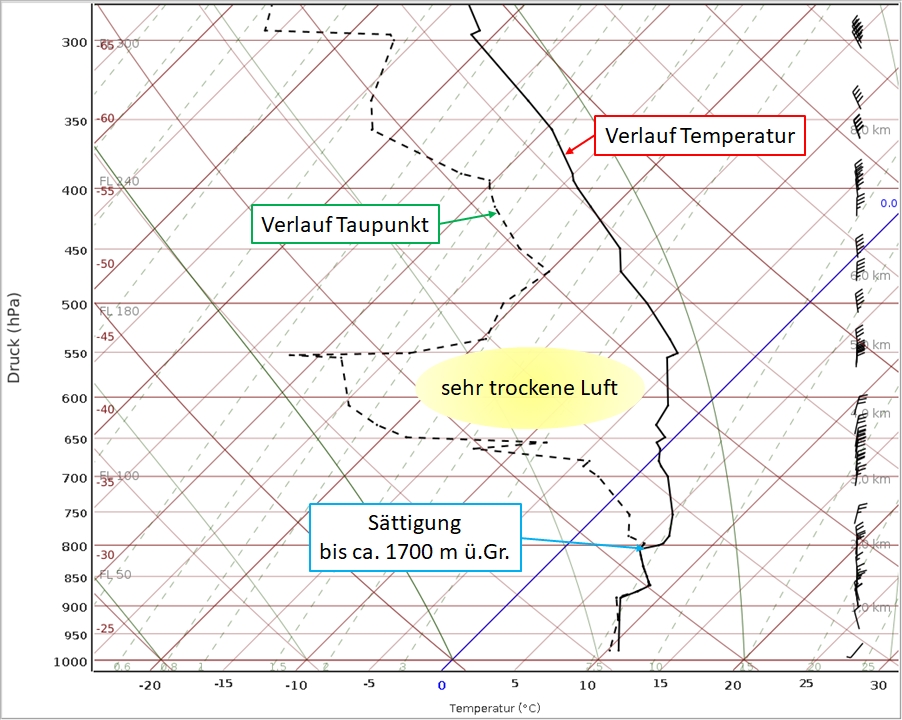 Man sieht schön, dass die Luft bis 800 hPa (etwa 1700 m über Grund) gesättigt ist. Taupunkt- und Temperaturkurve fallen also quasi zusammen oder anders ausgedrückt: Die relative Luftfeuchtigkeit beträgt 100 %. Bis hierhin reichen damit auch die dichten Wolken, denn darüber gehen die beiden Kurven wieder deutlich auseinander. Die Luft wird also immer trockener.