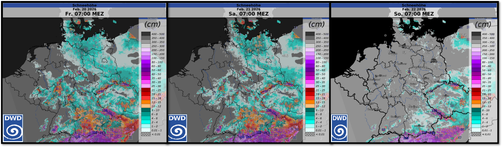 Änderung der Schneehöhe über Deutschland von Freitag, den 20.02.2026 bis Sonntag, den 22.02.2026. Flächige Darstellung aus dem SNOW-Modell, Einzelwerte aus dem Bodenmessnetz. (Quelle: DWD)