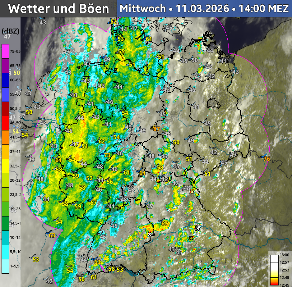 In der Nacht überquert die Front unter stetiger Abschwächung dann weite Teile des Landes und erreicht den Osten und Südosten, um sich hier aber zusehends aufzulösen. An den Alpen kann es oberhalb von 1000-1200 m sogar wieder etwas schneien.