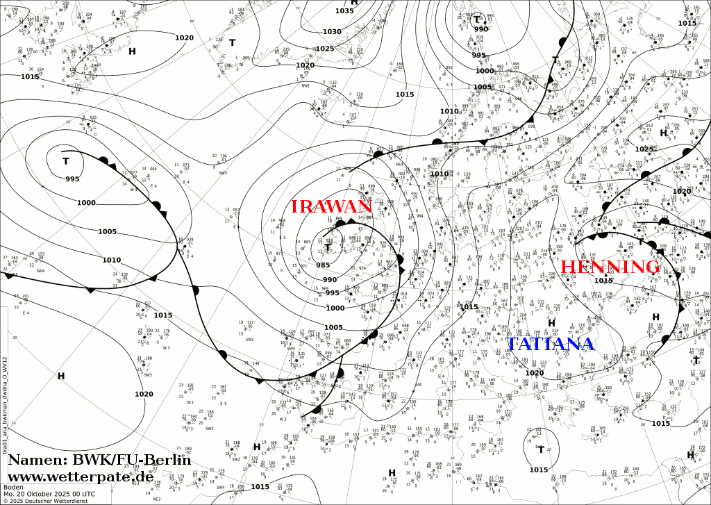 Abbildung 1: Aktuelle Wetterlage mit abziehendem Hoch „Tatiana” und neuem wetterbestimmendem Tief „Irawan”.