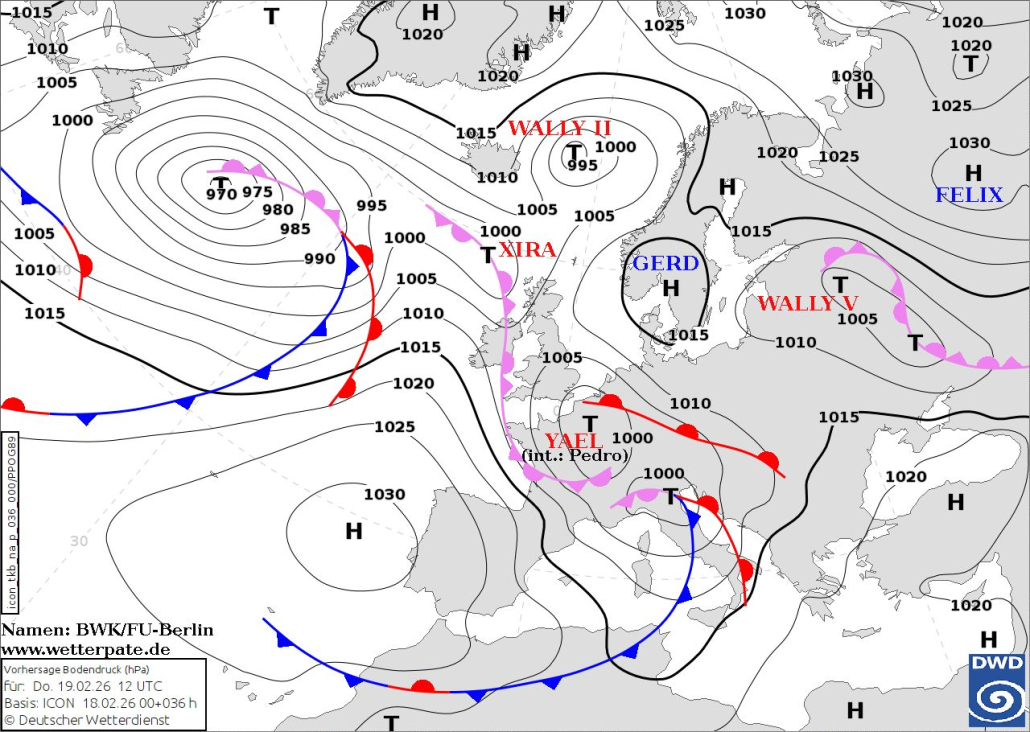 Prognosekarte Bodendruck und Lage der Fronten mit Namen der steuernden Hoch- und Tiefdruckgebiete für den heutigen Donnerstag, den 19.02.2026 12 UTC